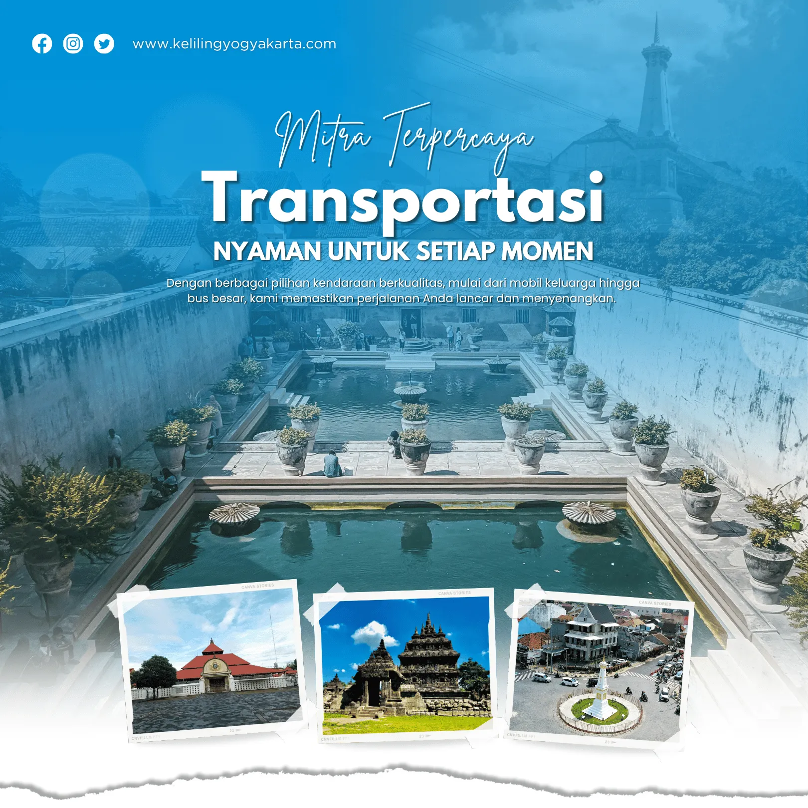 KelilingYogyakarta.com adalah layanan rental mobil dan penyedia paket wisata di Yogyakarta yang berkomitmen memberikan perjalanan nyaman, aman, dan berkesan bagi setiap pelanggan.